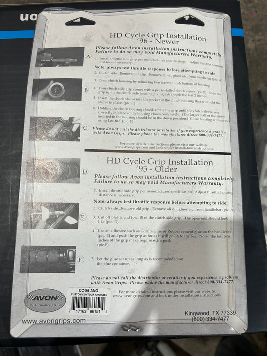 Avon performance grips AVG-CC-86-ANO custom contour handgrips black for Harley Davidson with throttle cableVendor:MeanStreak ChoppersRegular price $130.00 AUDRegular priceUnit price per-