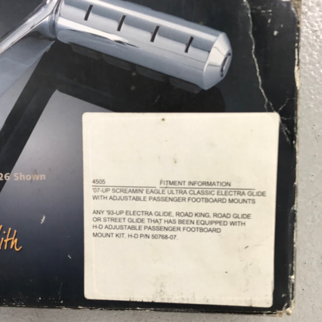These kits give passengers the ability to move their feet from the board to the peg, or best of all, they can lay their calves on the pegs when the driver has their feet on the highway pegs. You will love the flexibility. A bolt action locking device on the swing arm adds an intermediate position to make hours in the passenger seat more enjoyable for passengers of different heights and does not interfere with footboard operation. These work perfectly with stock 93-09 chrome Harley Davidson adjustable passenger board mount kit (HD P/N 50768-07) or Kuryakyn P/N 7906 ISO-Passenger Boards, as well as 07-09 FLHTCUSE.