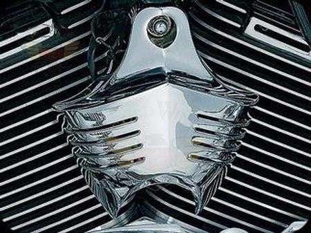 A great way to spiff up the left side of your Vulcan 1500/1600, or VTX1800. Our V-Shield Cover adds a sinister look to the engine bay of your big, V-Twin Cruiser. Chrome-plated die-cast construction makes this stout looking piece a worthwhile addition.