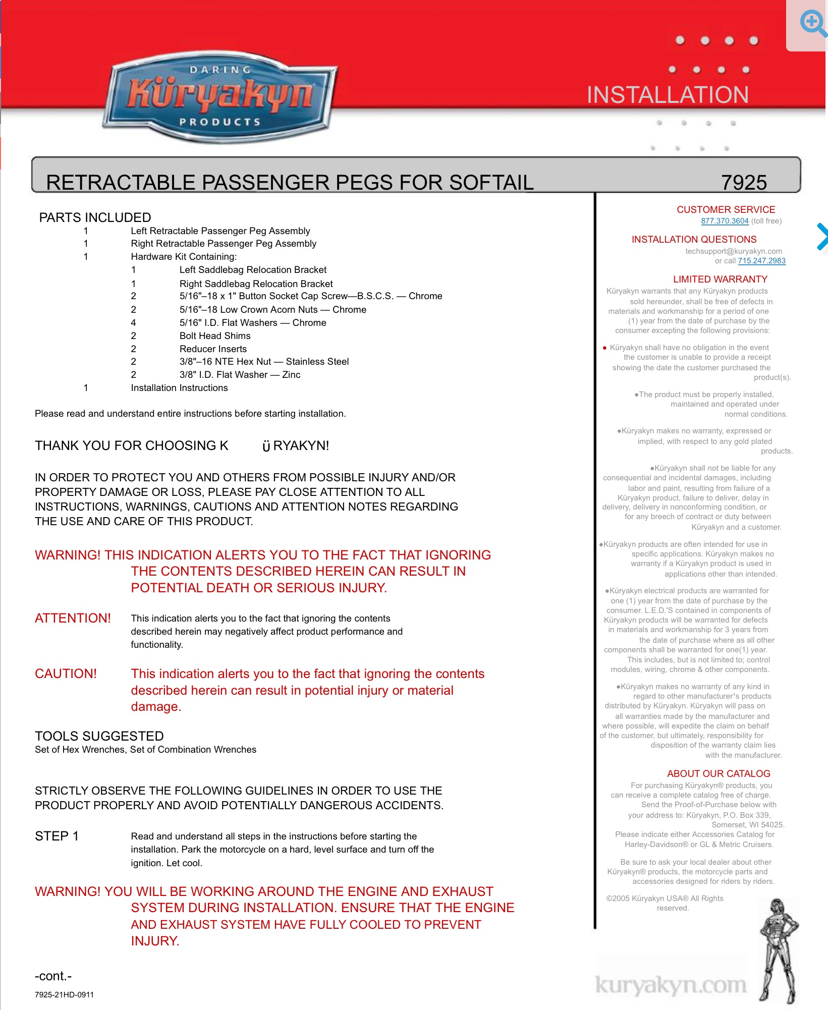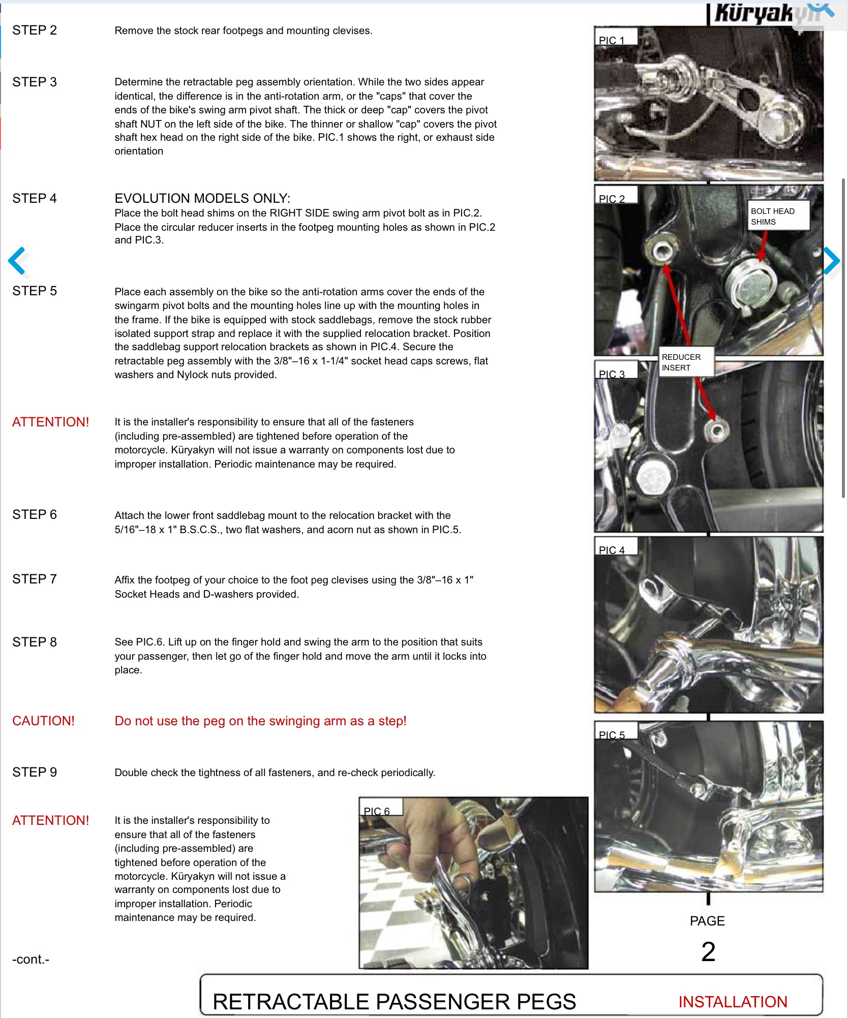Easy One-Bolt Installation on Either FXST or FLST Models Provide Four Positions for Alternative Footrest Placement or Out of the Way Storage. The Retractable Arms Come Equipped With Kryakyn Small ISO-Pegs or Add a Female Clevis for Any H-D Style Male Mount Peg. An Optional Floorboard Adapter (P/N 7924) Will Permit the Use of O.E.M. H-D Passenger Floorboards or Kryakyn's Awesome ISO-Passenger Boards.