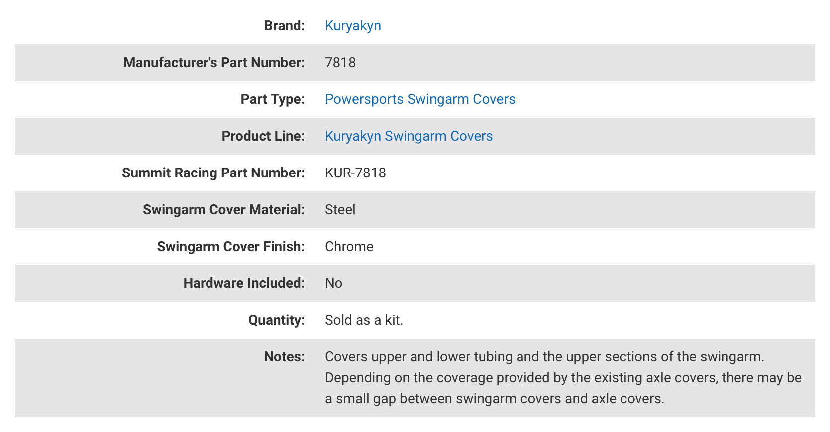 These Kuryakyn swingarm covers really set your motorcycle rear-end off. These swingarm covers are made from high-quality durable steel and give your motorcycle a custom-look chrome finish. These swingarm covers from Kuryakyn include all necessary hardware and detailed instructions for installation. All swingarm covers are specifically designed to fit your model.